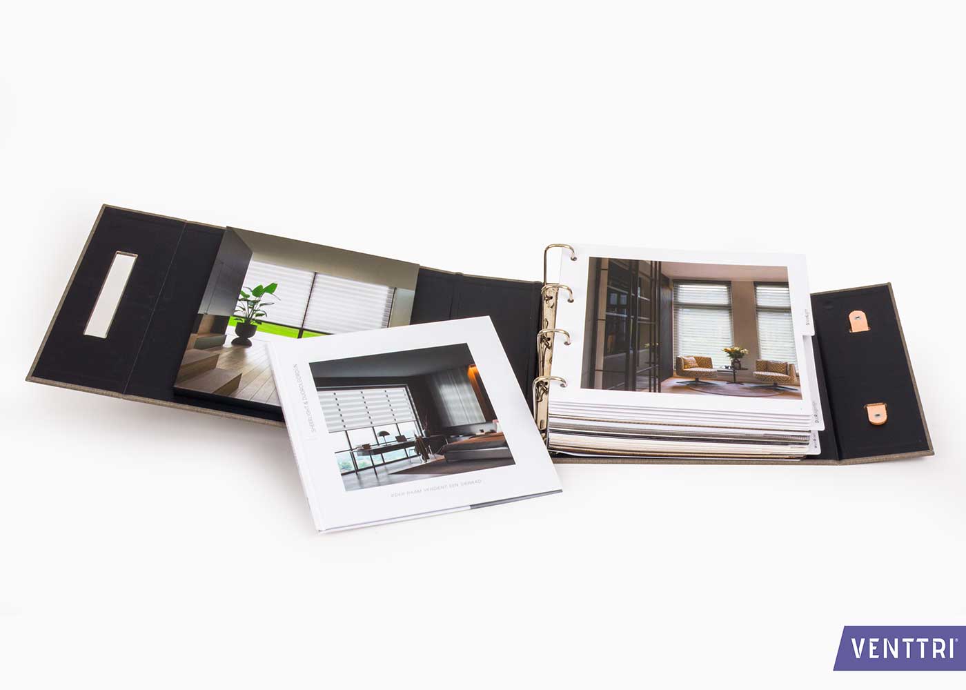 On the left side, a special insert has been added in which an additional mood book can be neatly stored. On the right, you’ll find a high-quality ring mechanism with sturdy 2 mm end sheets, filled with inspiration images and carefully organised roller blind samples.