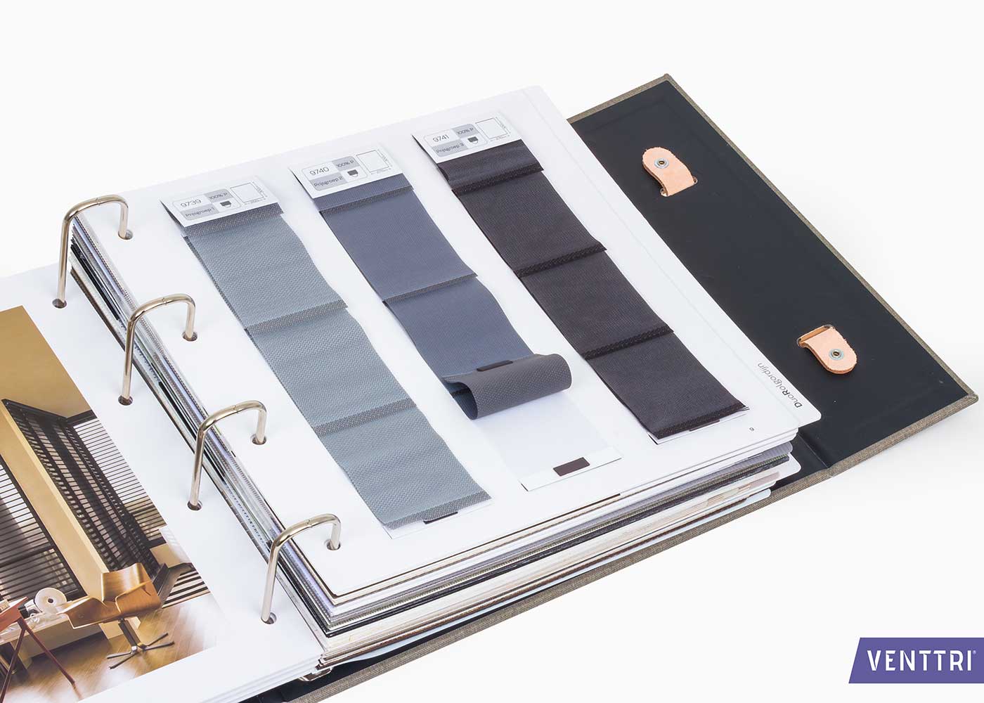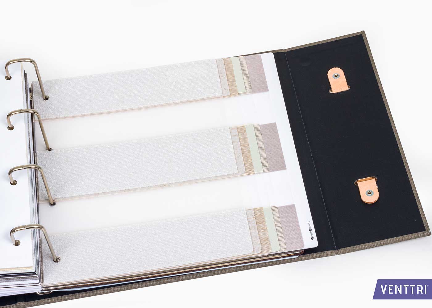 At Venttri, we ensure that all samples are cut precisely to size so that they fit perfectly within the presentation product and create a uniform, high-quality look. The book also contains integrated magnets, ensuring that components stay firmly in place and can be viewed easily without shifting.