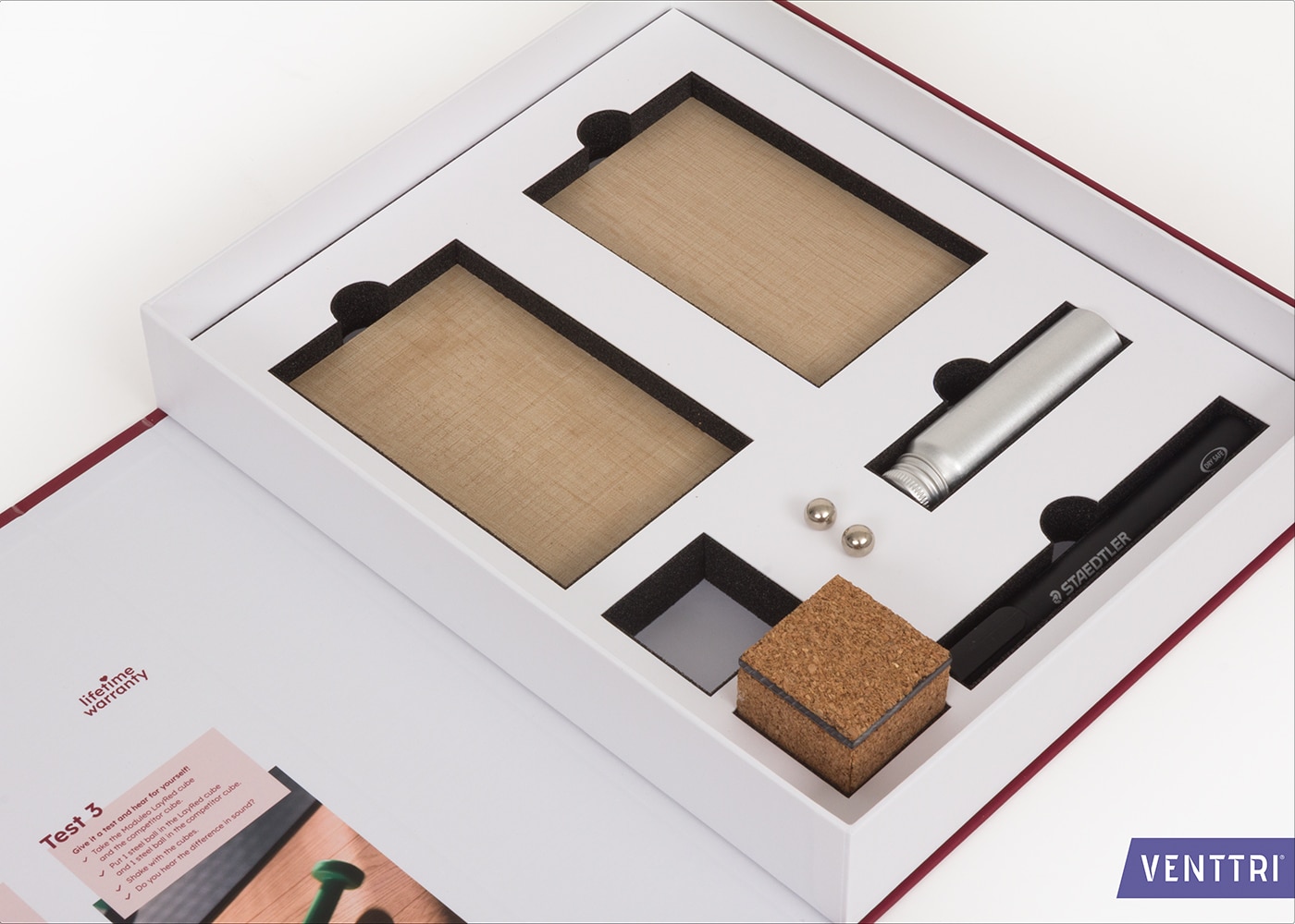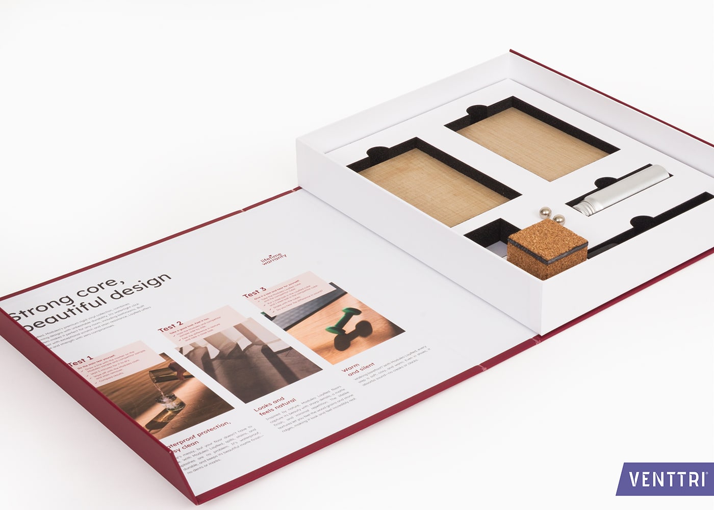 Inside, a foam interior is finished with a white cardboard cover. This gives the inside a luxurious appearance and keeps the samples and products firmly in place. The foam is custom-milled so the contents are neatly and safely presented.