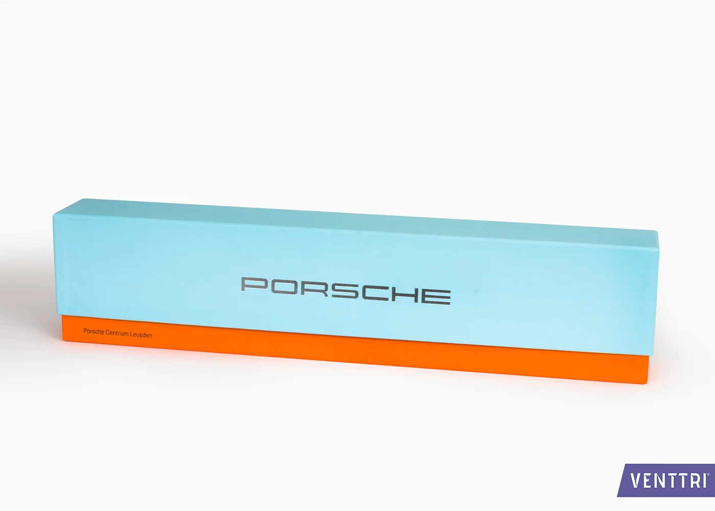 For Porsche, Venttri developed an exclusive box with lid – perfectly suited as a premium presentation package for accessories or documentation. The base and lid are made from robust black board and wrapped in gold-coloured paper, creating a luxurious appearance. The logo is elegantly finished with gold foil, adding a refined and eye-catching detail.
